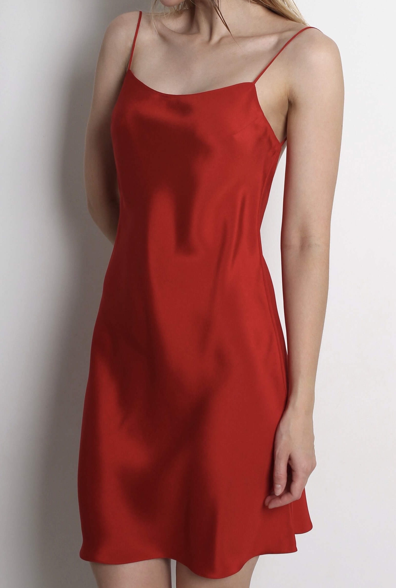 Платье-комбинация из плотного французского шелка кади, насыщенного цвета с глубокой открытой спинкой, в длине мини. Изделие имеет косой крой, идеально ложиться и струится по телу.